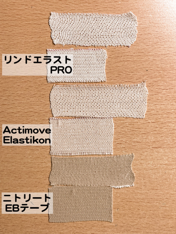 この中の製品をいくつか使ったんですが、J&J/エラスチコンとニトリート/EBテープはかなり別物な感じでした。ざっくり分けると基材の布の伸縮率が高いタイプと低いタイプ。